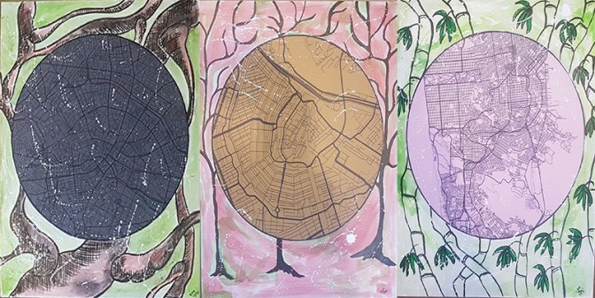 Titres des oeuvres (2020) : San Francisco green, Amsterdam green, Cherbourg green, Dreamland green, Berlin green, Brest green, Bruxelles green