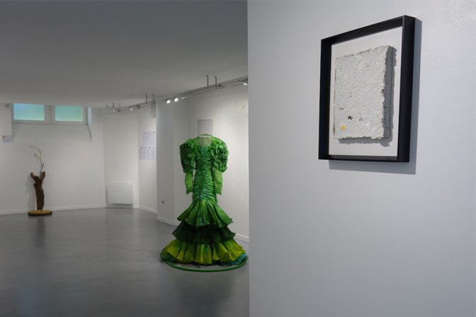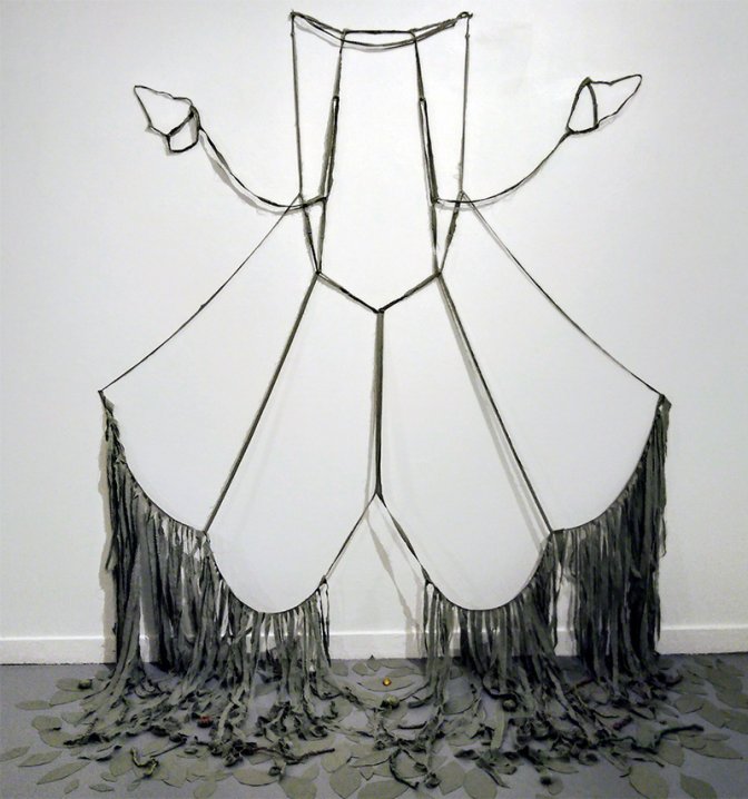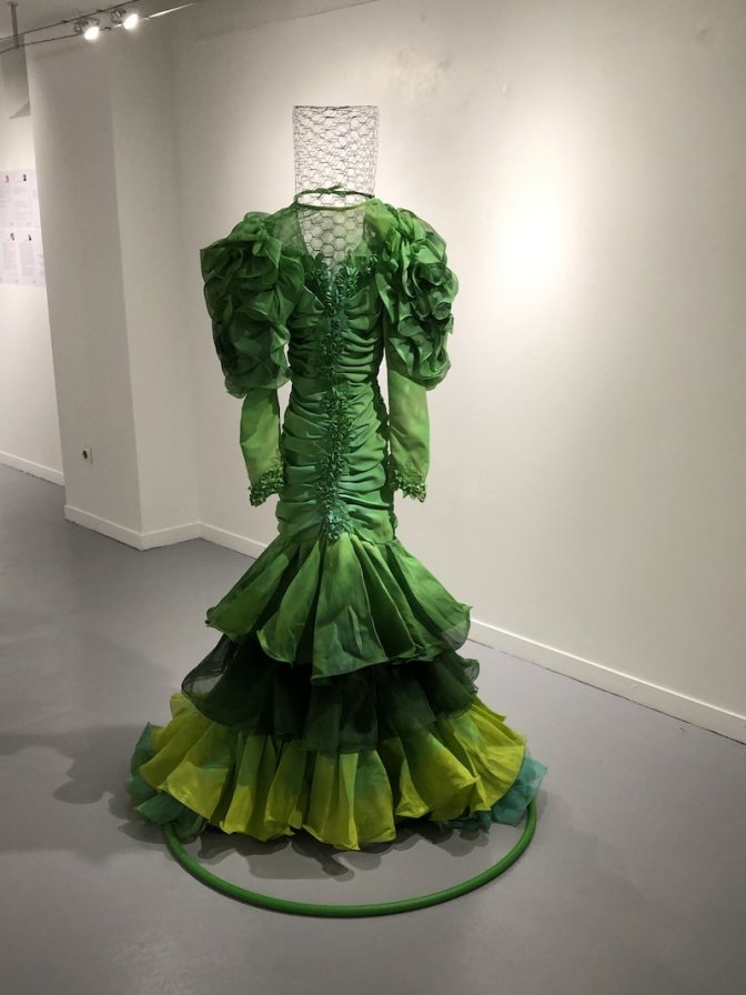 Cohabitation coriace, Jeu de dupes ?, 2020 (robe de mariée, peinture, cerceau). Qu’avons-nous fait de la terre ? Cherche alliances durables et sérieuses - entre l’hyper consommation, l’hyper production, l’hyper destruction, l’hyper progrès, le greenwashing… et la flore, la faune, la sauvegarde de la diversité, le changement, la préservation de la nature… pour la survie de toutes les espèces vivantes car elles sont irremplaçables. Une alliance entre la nature et les activités humaines est-elle possible ?