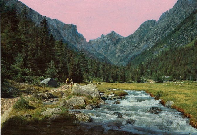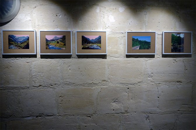 Titre des œuvres (2018 et 2020) : Ossature- Cycle (tissu) ; Au plus sauvage (cartes postales et peinture). Cartes postales retouchées : Disparition - Maison Gachet ; Disparition 1 - Auvers ; Éternelles vacances - A cheval ; Éternelles vacances - Partie de pêche ; Éternelles vacances - Il n’y a plus de...