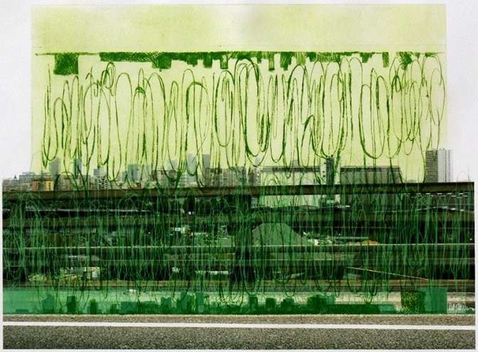 Un long et pénible embouteillage m’a permis d’observer les alentours. Cet endroit était la villégiature de prédilection des peintres impressionnistes et bourgeois parisiens, et parmi eux la famille des Manet. Aujourd’hui ce paysage a fortement changé. La Seine est domptée par les berges bétonnées et les entrepôts des entreprises ont remplacé les jardins verdoyants. Jusqu’à l’horizon marqué par la Défense le paysage urbain est dépourvu de nature vivante. Une forte volonté d’apporter de la VERDURE m’est naturellement venue. C’est ainsi que l’œuvre photo/carborundum " RÉSILIENCE URBAINE " est née.