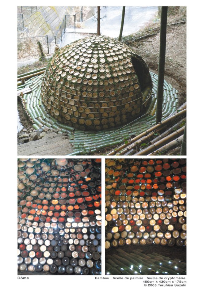 La forme de Dôme rappelle la silhouette des tunnels et pointe l’idée d’une traversée de lumière. La structure du bambou est creuse et rappelle aussi l’idée du tunnel. Dôme est constitué de 900 segments de bambou empilés. Chaque segment de bambou comporte une cloison interne, fine et parfois percée d’un trou pour les empilements les plus bas.
